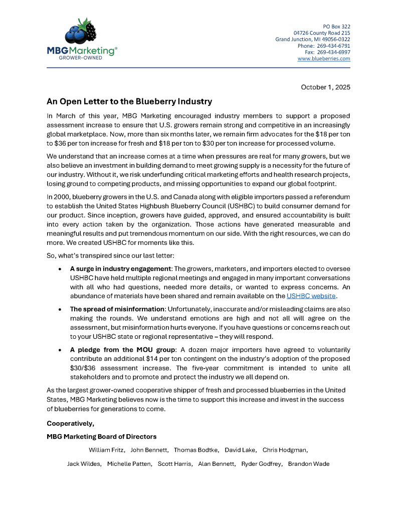 Please take a moment to read the latest letter from the MBG Board of Directors reaffirming their position on the USHBC Assessment Increase.